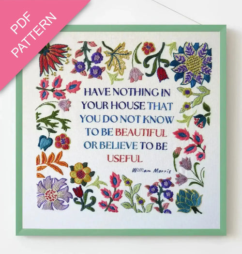This famous quote by William Morris is beautifully stitched surrounded by a selection of Morris' own wonderful floral elements.