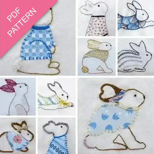 Embroidery PDF Pattern for the Fanciful Rabbits Design with full colour photos and a step by step process.