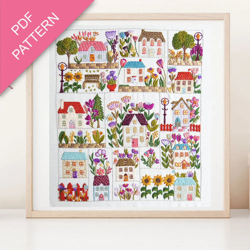 Embroidery PDF Pattern for the 'Village in Bloom' hand embroidery design with full colour photos and a step by step process.