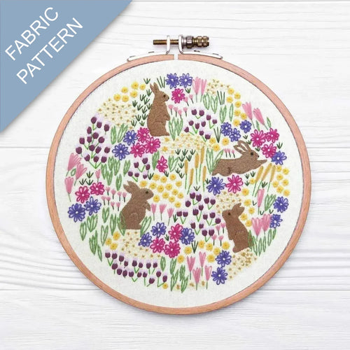 Wild Flowers and Rabbits, Pre Printed Embroidery Fabric Panel PLUS PDF Pattern