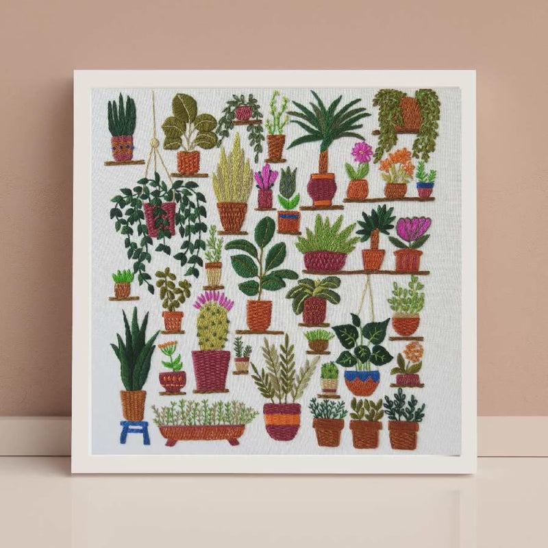 Embroidery for experienced stitchers Easy-to-follow printed pattern with clear step-by-step instructions Pre Printed fabric pattern and Calico stabiliser included to get you started right away Engaging design to inspire creativity and refine your technique Join a community of 46,000+ makers discovering embroidery with Stitchdoodles Skill level: Intermediate   Plantopia hand embroidery Escape to a wonderful world of plants with this modern hand embroidery sampler. There are 35 plants to enjoy stitching in this design and the end result is a striking design any plant enthusiast would love to own. The Plantopia Hand Embroidery Kit comes with all the Highest Quality materials you will need to complete the pictured design (apart from embroidery scissors).Optional Extra: You can choose to add on a Nurge Hoop for stitching the design if required. The design is approximately 7.5 x 8 inches square. Also available as a PDF download only as well as a Fabric Pack - you can find these in those sections of the shop. Embroidery Kit 16 colours of DMC Floss pre-wound - enough to complete the whole design. 15 inch square Premium Cotton with design pre printed on 15 inch square Soft Calico Stabiliser fabric Hand Embroidery Needle Size 7 & 9 & a Tapestry (Premium quality John James) Printed Pattern with step by step instructions and full colour photos.   Embroidery Kit + Nurge Plastic Square Hoop Everything included as per the Premium Embroidery Kit plus a No.4 sized Nurge Plastic Square Hoop (see photo) You can find out all about these fabulous hoops here. . Make your choice from the drop down menu above.