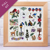 Framed cross-stitch kit with various designs including birds, flowers, and animals on a white background.